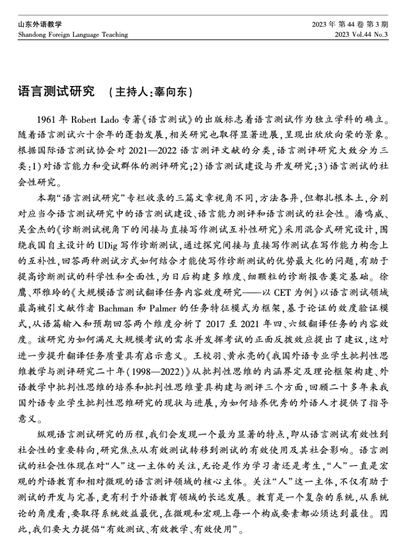 学报》第46卷第5期与北大核心期刊《山东外语教学》第44卷第3期“语言测试”专栏的主持人。作为外语界广受赞誉的两本专业学术期刊,邀请辜向东教授担任“语言测试”专栏的主持人,旨在以辜向东教授的语言测试专业知识和研究成果为引领,推动这一领域的学术交流、传播与进步。这也是辜向东教授第二次受邀担任《解放军漫蛙