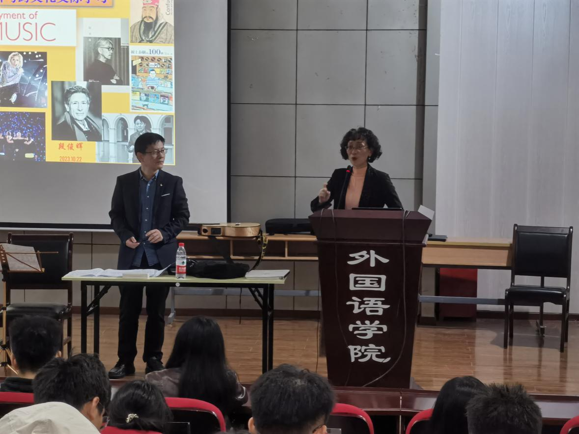 2023年10月22日晚,四川外国语大学段俊晖教授来校做了“英语歌曲赏析与跨文化交际学习”的主题讲座。讲座由漫蛙