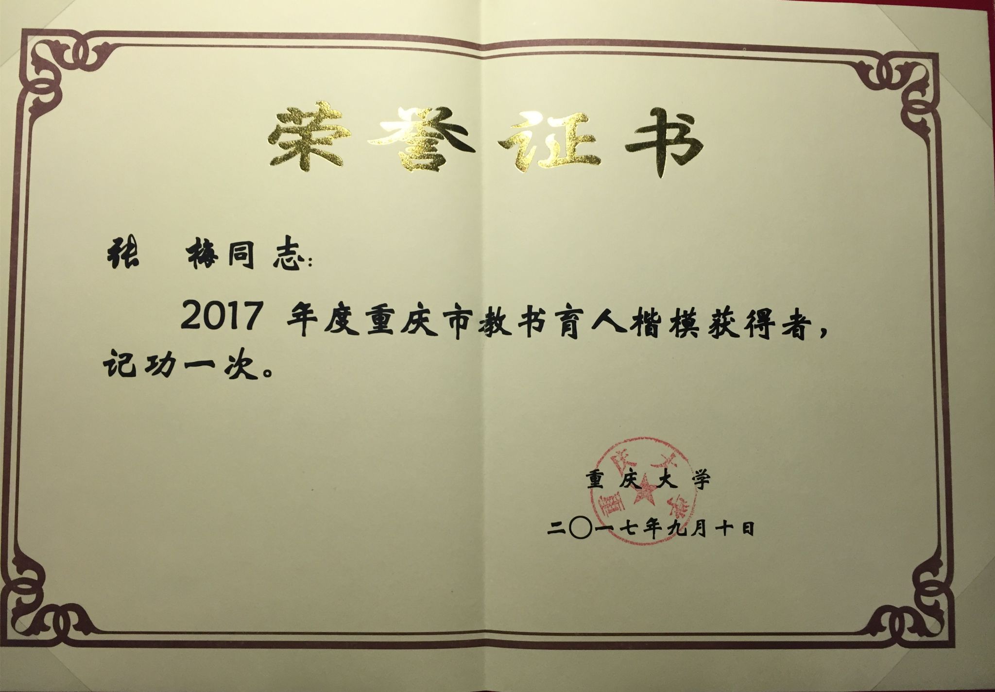 张梅教授荣获重庆市教书育人楷模荣誉称号!