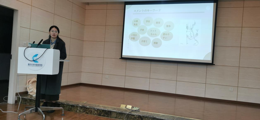 本期活动由大一薛耀康同学担任主持。大三张玉佳同学作为领读人率先开讲,她详细介绍了该书的写作背景,分享了国内对于《窗边的小豆豆》的阅读与接受情况。研一李柳燕同学也作为领读人分享了《窗边的小豆豆》在日本的研究与阅读概况,分析日本读者的读后感并展示了词云图研究成果,还就两篇代表性研究论述进行了具体介绍。大二叶夏馨同学作为领观人分享了该书衍生的影视作品《小豆豆电视台》的主要内容及重要片段,围绕影像与文本的关系进行了讨论。随后,与谈人大三吴笑恬同学由书中内容延申到明治维新时期日本肉食解禁的历史背景,帮助大家拓展了相关专业知识。另一位与谈人研二宋诗雨同学分享了自己读后的感想。以上由活动策划小组同学们带来的精彩分享,让参与者对作品有了多角度的深入理解。