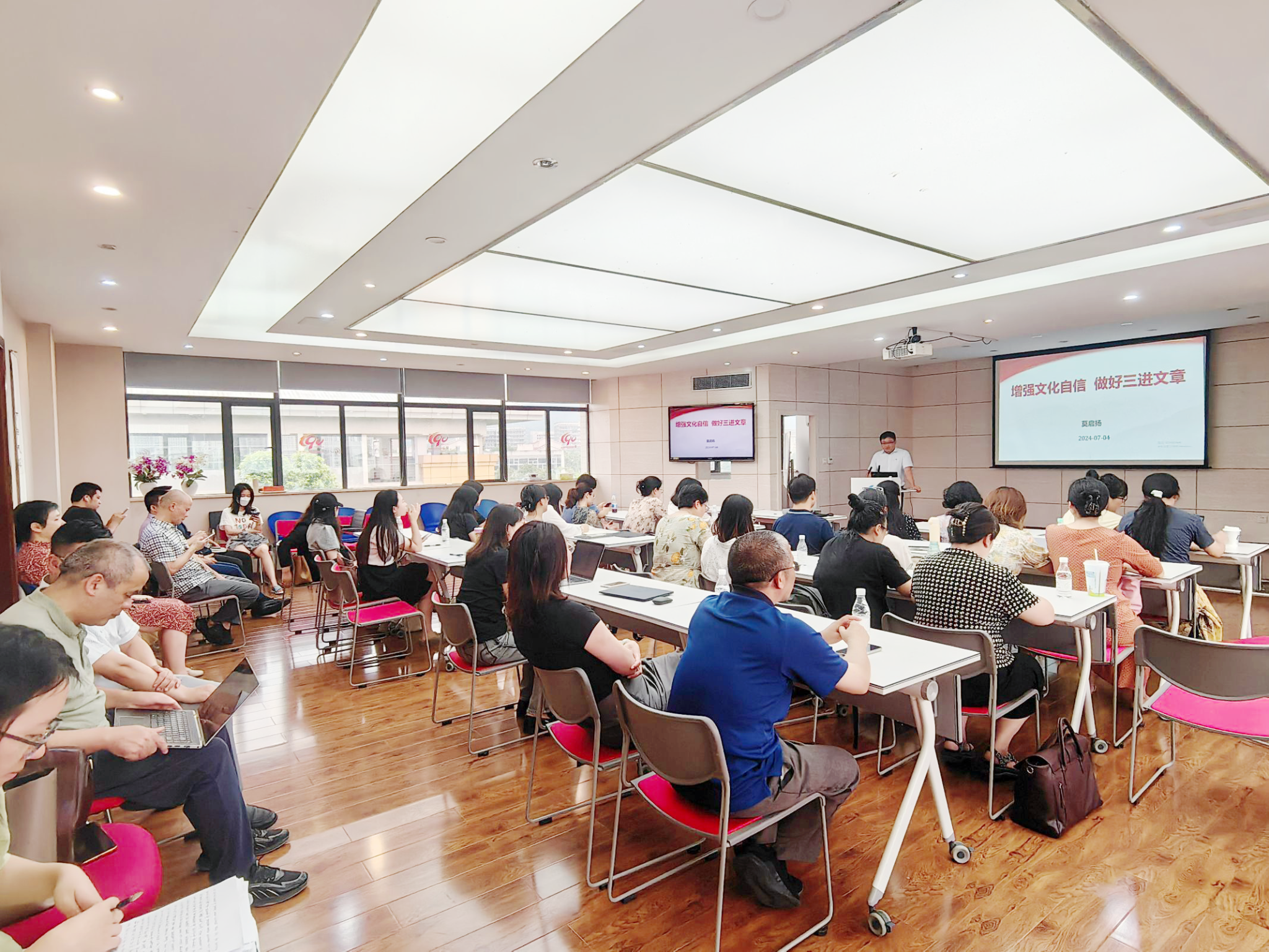 莫启扬院长带领我们回溯了中华文明的悠久历程,着重阐述了其独有的五大特性:连续性、创新性、统一性、包容性、和平性,深刻剖析了这些特性如何共同构筑起我们坚定的文化自信,并阐明在高等教育体系中,这份文化自信占据着核心地位,是不可或缺的精神支柱与灵魂所在。莫院长在讲座中特别指出,文化的传承与弘扬必须深深植根于价值观教育之中,以培育学生深厚的文化认同感和自豪感,而强调社会主义核心价值观在当代中国教育中的重要作用,也进一步体现了开展“三进”工作的必要性。