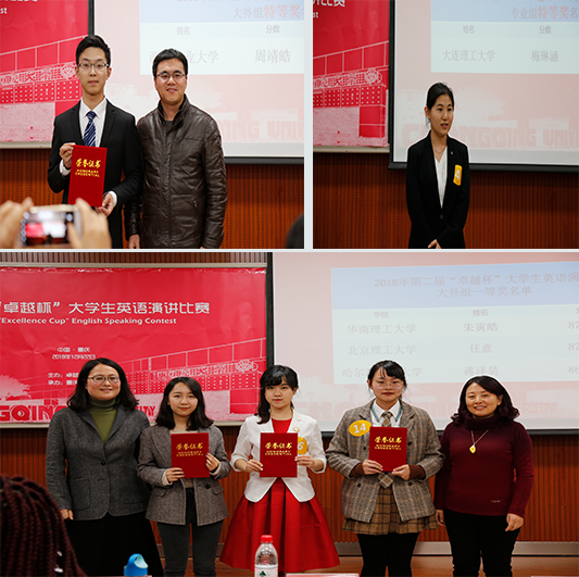 虎溪校区参加了第二届“卓越杯”大学生英语演讲比赛复决赛。西北工业大学罗鑫、大连理工大学梅琳涵分别夺得大学外语组和英语专业组的冠军。我校2017级英语专业张菁淳位居英语专业组第二名并荣获一等奖,英语专业的翟诗文获得二等奖;葛屹、郑雨馨获得大学英语组的二等奖。
