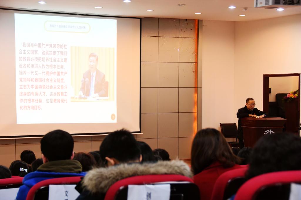 魏强博士从引导学生不断坚定理想信念、引导学生不断厚植爱国情怀、引导学生不断加强品德修养等方面重点解读了新时代教育工作根本任务,即培养一代又一代拥护中国共产党领导和我国社会主义制度、立志为中国特色社会主义奋斗终身的优秀人才。魏强博士结合国际国内形势,旁征博引,谈到我国高校思想政治工作目前面临的形势,谈到作为高校外语教师,在教书育人中要坚持正确的价值导向,要和思政课同向同行,守好一段渠 种好责任田,在外语教学中融入爱国主义教育、理想信念教育,引导学生将爱国主义和社会主义相统一,听党话跟党走。