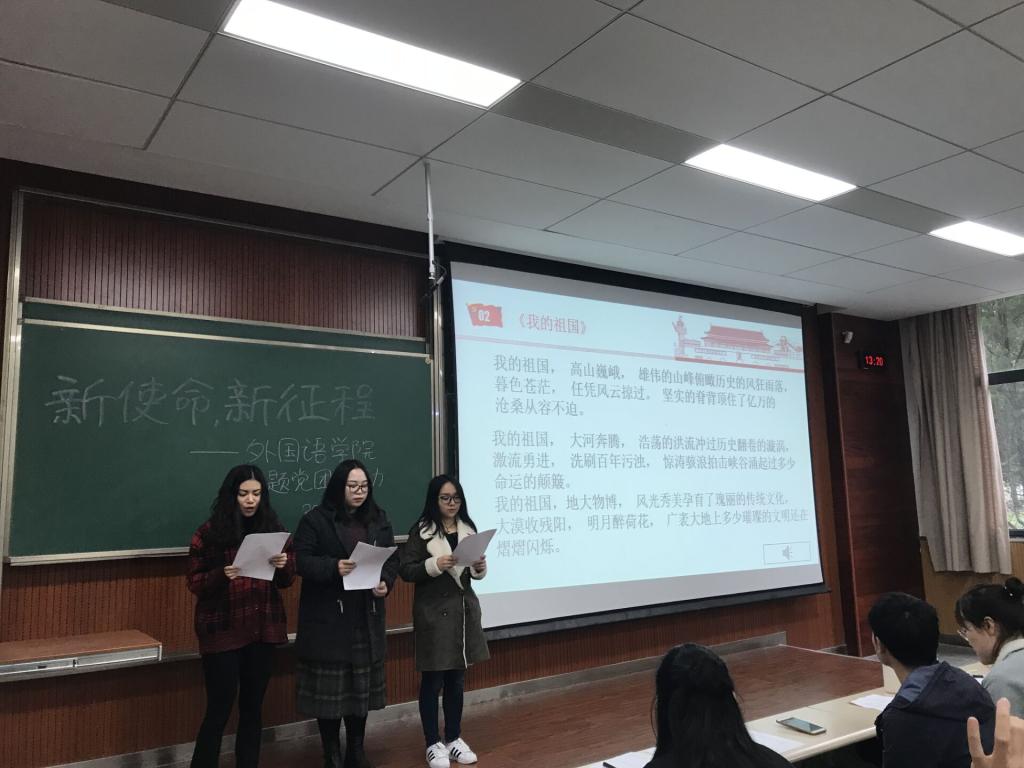 在知识问答环节中,同学们热情高涨,踊跃举手回答,并积极互动,体现出对新时代时事的关注和对党团活动的高度赞同。最后的“诗歌朗诵”环节中,同学们满怀深情朗诵了沁园春·《赞中华盛世》、《祖国啊,我亲爱的祖国》、《我的祖国》等著名诗歌,引起全场一致的情感共鸣。
