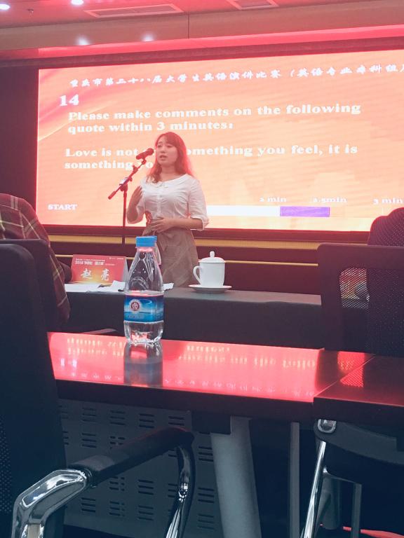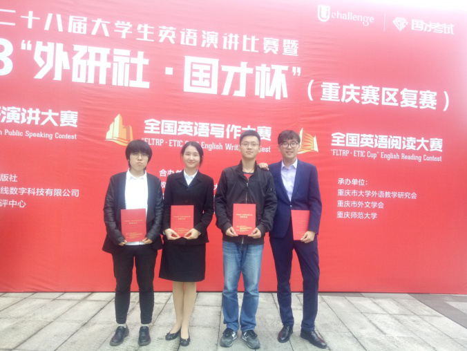 重庆市第二十八届大学生英语演讲比赛于上午九时进行,我校本科组与研究生组的7位选手积极沉着迎战,表现出色,最终蔡栩丞和郑雨馨两位同学脱颖而出,囊括大学英语本科组一二名,获特等奖,进入当天下午进行的“外研社·国才杯”全国英语演讲大赛重庆赛区复赛;李艾泽与张菁淳同学分获本科组二等奖与三等奖;来自研究生组的李俊杰、尹思力及高婉璐同学分别获得本组的一等奖,二等奖和三等奖。
