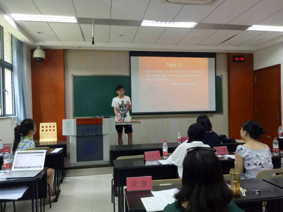 6月28号下午14:00,公外研究生演讲大赛就开始紧锣密鼓地进行选手报到及抽签出场的准备工作。公外研究生课程组的各位老师为顺利开展此次演讲比赛,大力支持与鼓励同学们积极参与踊跃报名。经过视频初赛的筛选,最终16名选手进入决赛。14:30,由英语专业研究生徐帅同学主持,演讲比赛正式拉开帷幕。比赛分为定题演讲和即兴演讲两个环节,在为时近2个小时的比赛中, 现场气氛紧张而热烈,参赛选手们语言标准流利,演讲内容清楚明确,演讲风格生动鲜明。经过选手们激烈的角逐与评审老师们专业的评选,来自计算机学院的李俊杰同学获得特等奖;经管学院的成果垒,化学化工学院的尹思力两位同学获得一等奖;温蕊,黄彪,陆鹏三位同学获得二等奖;王梓等四名同学获得三等奖;优胜奖由李孟泽等六位同学获得。此次演讲大赛由外语学院公外研究生课程组的陈晓莉,黄赟琳,向朝红,李雁,黄颖,邹远鹏六位老师组成专业的评审团队参与评审,体现了公开、公平、公正的原则。另外,研究生院助教团队牟佳星等同学积极参与协助本次演讲比赛,充分展现了我校英语专业研究生协调组织等多方面的综合能力。