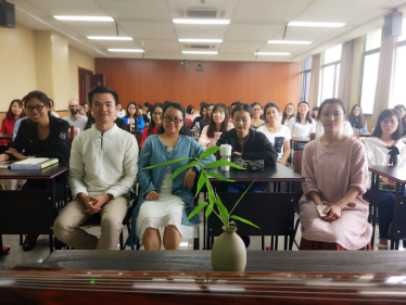 的院长彭静老师讲话。彭院长提到,古琴是中国最古老的艺术,希望这次讲座能够开启汉硕专业学生了解优秀中国文化的大门。她还表示,在从事汉语教学过程中,同学们也应该将中华优秀传统文化传播出去,让更多的人感受到中国的独特魅力。