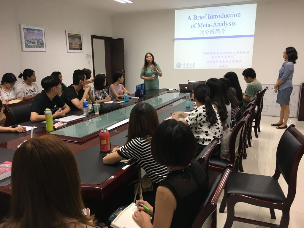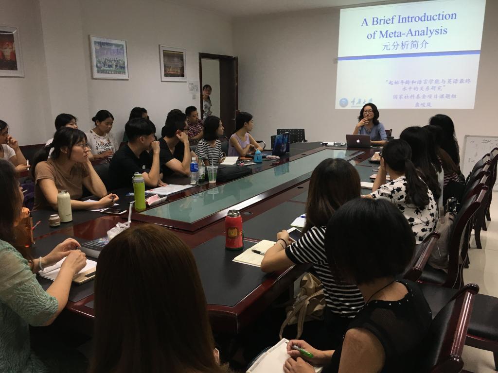 英语系盘峻岚老师做了题为“元分析简介(An Introduction of Meta-analysis)”的专题报告。此次学术沙龙由项目组负责人李红教授主持,20余名漫蛙