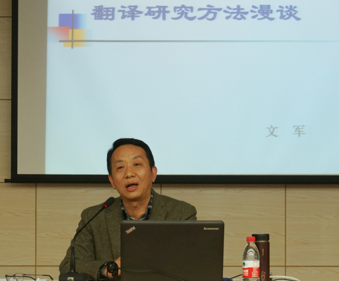 在第二场讲座“翻译研究方法漫谈”中,主讲人文军教授分享了一些自己研究翻译学的思想方法。文老师首先用study(研究学习)和research(学术研究)两个词进行辨析,强调后者更注重发现理解的过程,以小见大,指出工欲善其事,必先利其器,鼓励同学们由浅入深,掌握好方法才能更深入地研究。而后,文老师结合自身研究经验与理论,对翻译研究的主要方法进行了梳理和分析,向同学们介绍了归纳法,演绎法,调查统计、历时描写、语言学研究法、文化学研究方法、实证研究法等,并推荐了相关专业书籍,希望帮助同学们建立对于翻译学的更加清晰系统的认识,借此提高同学们的研究能力。