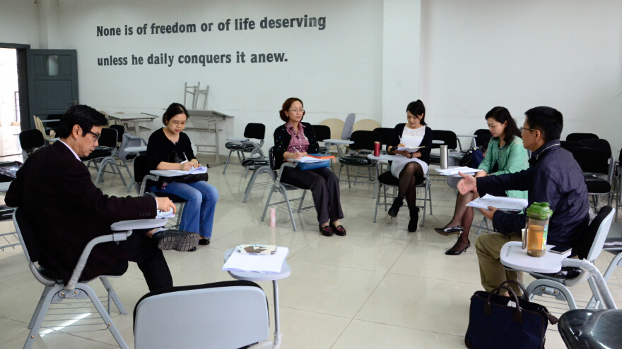 2014年10月23日下午2点,外语学院有关领导与大学外语教育中心的教授在虎溪校区综合楼513教室召开了关于公外研究生英语课程体系改革的启动会议。会议由欧玲副院长主持,学院党委书记余渭深教授,公外研究生课程组主任黄萍教授,大学外语教育中心课程教授朱万忠老师,建筑学科课程组主任周梅老师以及公外研究生英语课程组教师代表向朝红老师与李雁老师参加了讨论。
