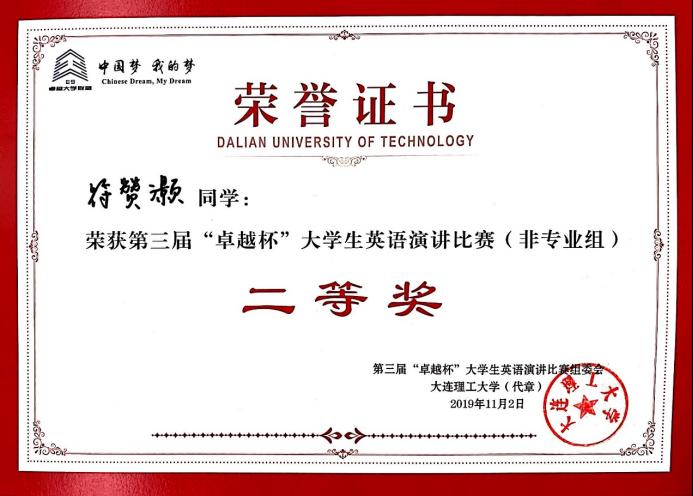2019级黄梦遥同学和2018级翟诗文同学在第三届“卓越杯”大学生英语演讲比赛中荣获一等奖,UC联合学院2017级符赞灏同学荣获二等奖,电气工程学院2019级李天一同学荣获三等奖。本次卓越大学联盟第三届“卓越杯”大学生英语演讲比赛复决赛在大连理工大学举办,我校英语专业组2人和非英语专业组2人参赛。