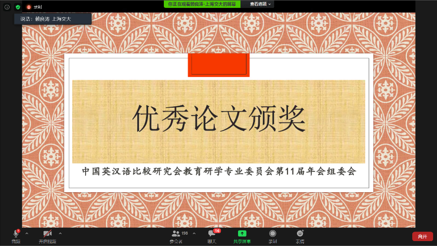 赖良涛博士主持简短的云端闭幕式。赖博士宣读了评审委员会审定的优秀论文获奖名单并代表常辉教授做下届年会承办单位代表发言,诚邀现场的各位专家学者、老师同学明年莅临上海交通大学。协办方华东师范大学出版社代表致辞,祝贺大会圆满结束。
