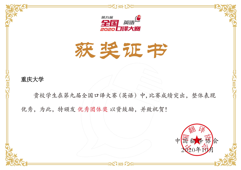 赢得了团体荣誉。这是对我校参赛选手突出表现的认可,是对站在选手身后给予指导与帮助的老师们工作上的肯定,也是我校在英语口译赛事中正式迈出一大步的重要见证,更能直接地鼓励我校广大学生参与到英语口译竞赛中来。