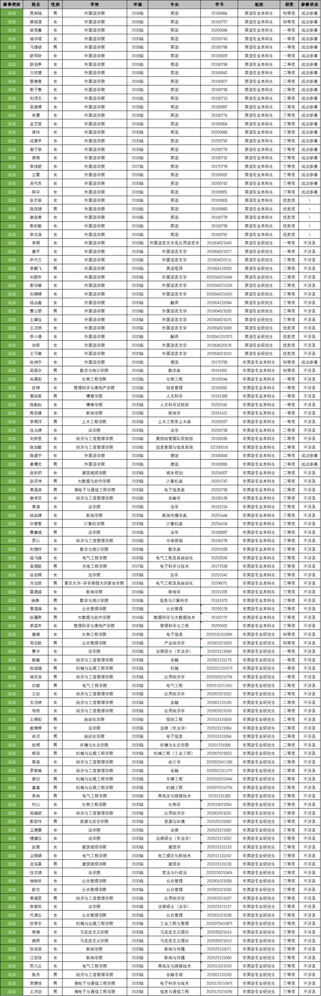 赛事选拔历时一个月,最终评定出253名获奖选手。其中,英语专业组获奖选手共87人,本科生获奖54人,研究生获奖33人;非英语专业组获奖选手共166人,本科生获奖79人,研究生获奖87人。具体获奖人数详情如下表: