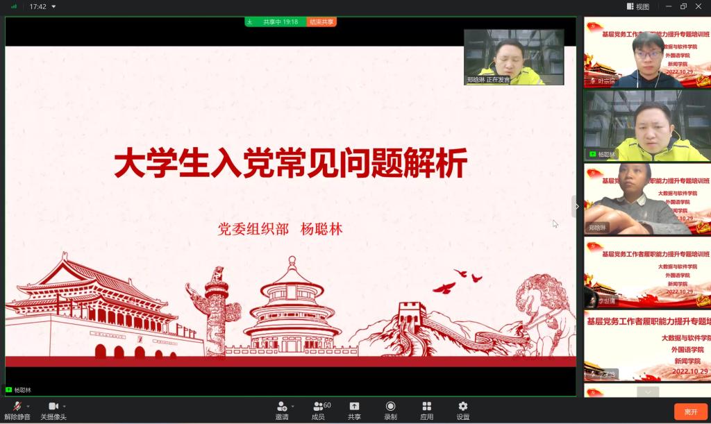 、大数据与软件学院和新闻学院采用线上会议的方式联合开展了“基层党务工作者履职能力提升专题培训班”第二讲。会议由大数据与软件学院党委组织员郑晗琳主持,来自大数据与软件学院、漫蛙