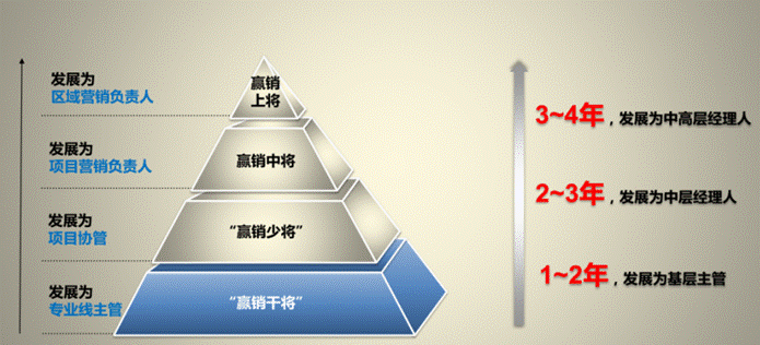 “赢销干将”培养计划是针对校园招聘营销管培生的发展而设置。项目通过导师辅导、集中培训、轮岗学习等多样化的培养机制及学习活动,全面提升“干将”综合素质及业务能力,使其快速成长为营销各专业条线基层主管,长期关注并往区域/项目营销第一负责人方向储备培养。