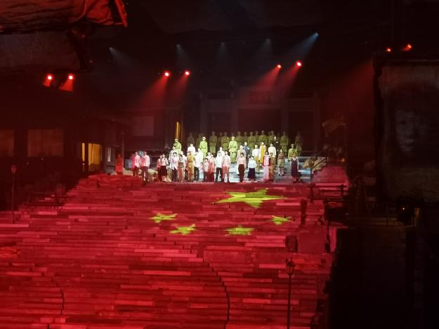 《重庆1949》是对红岩烈士们信仰、抉择、牺牲和新生的完美诠释。枪声在耳边响起,炮弹“震翻”座椅;透过牢笼,甚至看得见革命者脸上的血在流淌;抬头仰望,滚滚的江水从天而降。每一分每一秒,眼前的景物都在变化,仿佛真正置身于当年激荡起伏的革命岁月中。其中有一幕给成员们留下了很深的印象。当新中国成立的消息传到狱中,烈士们拿一床红被子做一面五星红旗,每个人都在诉说着自己心中的梦想,期待着出去的那一天,期待着新的生活。这一幕让我们无比真切的感受到了他们也曾离希望那么近,最后的牺牲更是让人痛心。看完剧目,成员们心中深深的震撼感迟迟无法消散。1949不仅仅是一个简单的数字,更是历史厚重一页浓墨重彩的一笔。《重庆1949》以一种在当代社会喜闻乐见的形式,将历史送至观众眼前,结合科技模拟出更加真实的效果。历史的厚重感和隔阂感在这一瞬间变得很薄,仿佛一瞬间触手可见。