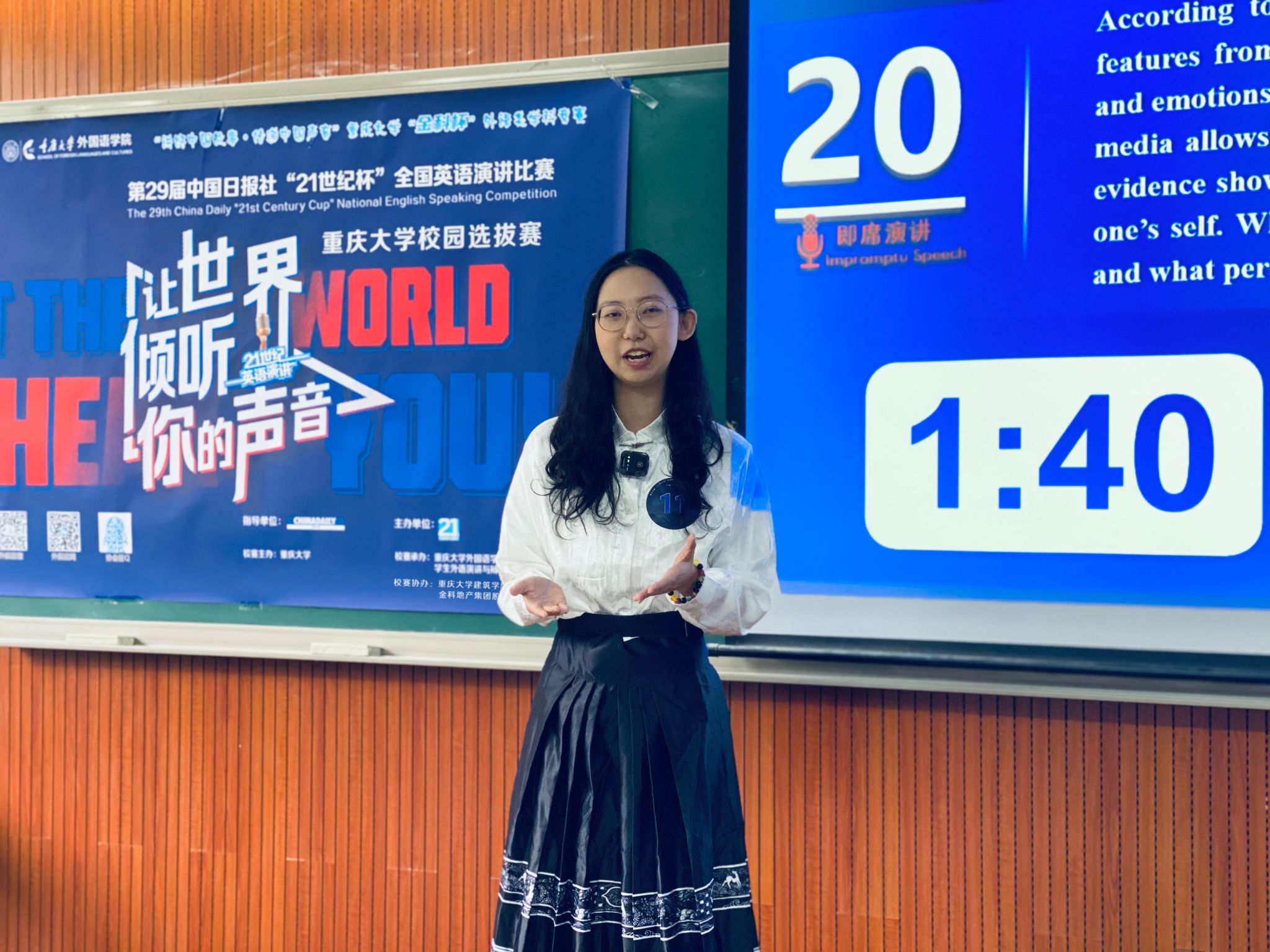 校选赛在虎溪校区第一教学楼D1202圆满收官。本赛事由中国日报社主办、21世纪英语教育传媒承办,大赛校选赛由漫蛙
