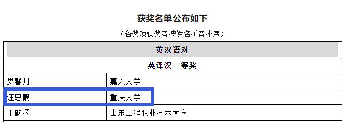 7人获奖。2021级英语专业本科生汪思靓从英译汉组一万五千多名选手中脱颖而出,以第二名的优异成绩荣获英译汉一等奖。另外6人获得优秀奖。