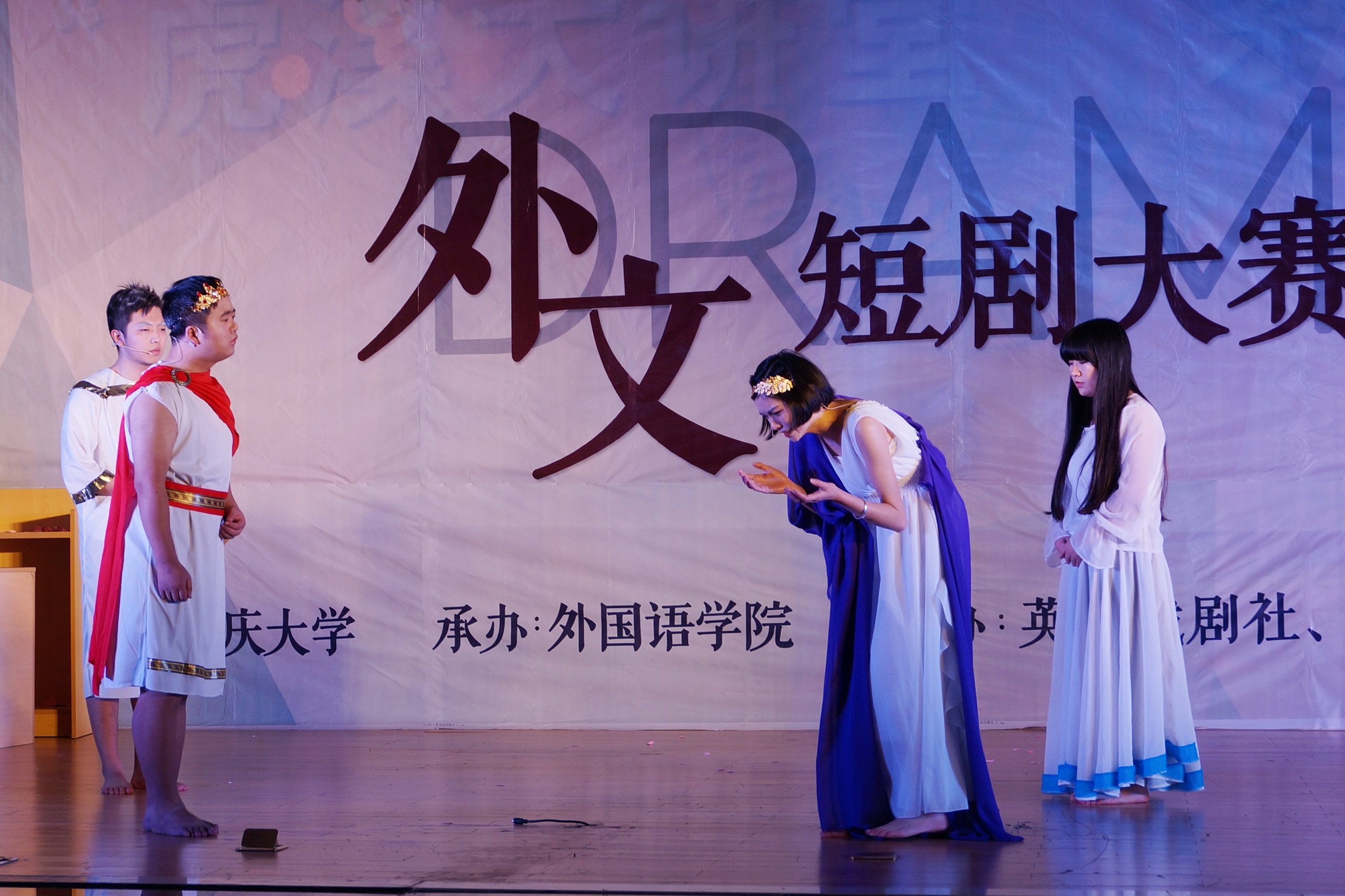 第十五届外语文化节系列活动之外文短剧大赛决赛在虎溪校区图书馆报告厅拉开了帷幕。本次活动由漫蛙