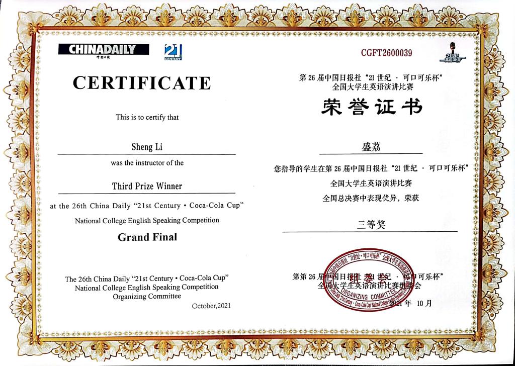 我院英语专业学生杨宇瑄荣获第26届中国日报社“21世纪·可口可乐杯”全国大学生英语演讲比赛全国三等奖