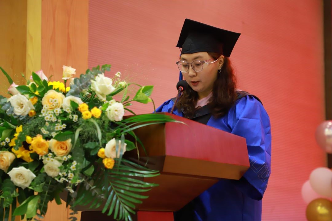 毕业研究生代表赵家宁在发言中感念重大之“大”,感谢母校为他提供了足够多的机会和平台,让他能够结识良师益友、拓展国际视野、厚积薄发。作为汉语国际教育专业毕业生,他通过两年在重大外院的学习和生活,更加坚定了“讲好中国故事,传递中国声音”的信念与决心。同时,赵家宁勉励同学们“道阻且长,行则将至。永远赤诚,永远做炬火,永远做心怀家国、不负使命的重大外院人”。