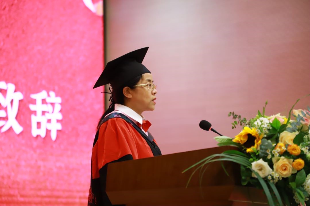接着,彭静院长代表学院发表致辞。彭院长首先对2022届212名毕业生表达了真诚的祝福,对一直以来支持学院工作的学生家长、用心育人的老师表示了衷心的感谢。她借此契机回顾了外院人共同奋斗、挥洒汗水、共同成长所取得的累累硕果,勉励各位毕业生始终秉承重大外院人“学贯中西,梦飞寰宇”的初心,在未来的工作和学习中,寄语所有毕业生“学会做人、学做真人;学会做事、学做实事;终身学习、永逐真知”。