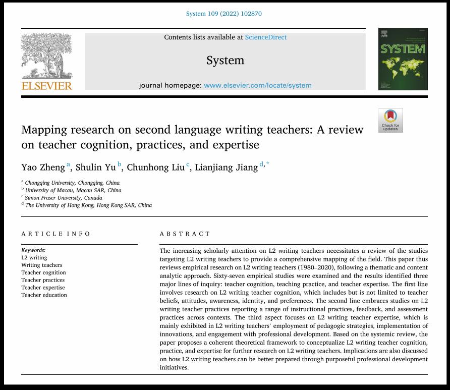 近期,我院教师郑尧博士(第一作者)与澳门大学于书林博士、加拿大西蒙弗雷泽大学刘春宏博士以及香港大学蒋联江博士的合作研究成果“Mapping research on second language writing teachers: A review on teacher cognition, practices, and expertise”在SSCI语言学期刊System上发表(2021影响因子/JCR分区:4.518/Q1)。该文是郑尧博士主持的国家社会科学基金项目“积极心理视域下中国外语学习者多语写作投入的多维度动态研究”(21CYY018)的阶段性成果。