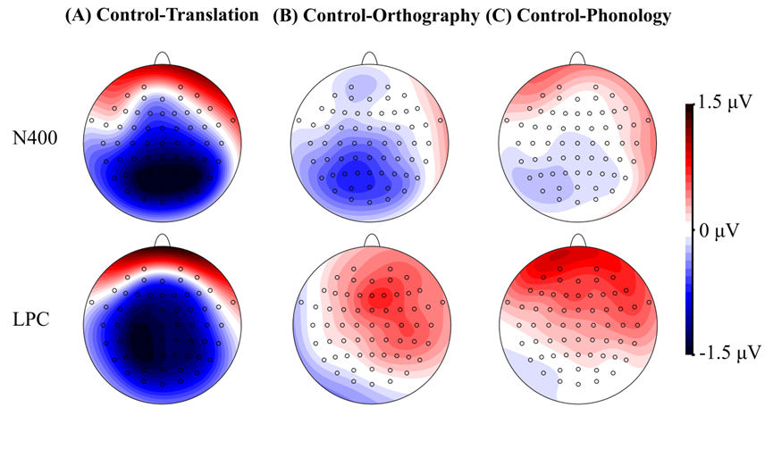 语言认知及语言应用研究基地曹洪文团队研究论文“An ERP study of cross-modal translation recognition in Chinese-English bilinguals: The role of cross-linguistic orthography and phonology”。该论文主要使用事件相关电位技术(Event-related Potential, ERP)考察非平衡中(L1)-英(L2)双语者在加工听觉L2词汇的过程中,跨语言正字法(orthography)和语音(phonology)信息表征的认知神经机制。