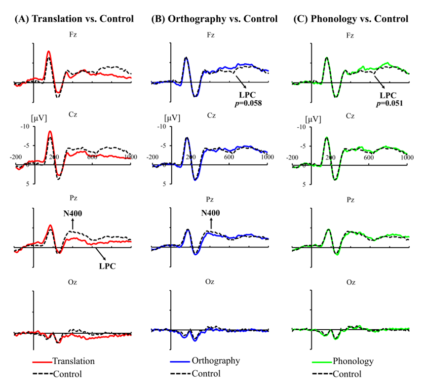 根据双语交互激活模型,双语者在加工目标语言时,非目标语言词汇-语义/概念信息会自下而上(bottom-up)地非选择性激活,同时自上而下(top-down)的抑制控制(inhibition control)机制也会组织和调节语言间词汇(lexical)-语义(semantics)信息的竞争和冲突。基于上述理论框架,该论文采用跨通道翻译识别任务,考察非平衡中(L1)-英(L2)双语者在加工听觉L2的过程中,跨语言正字法(orthography)和语音(phonology)信息表征的时间动力学特征和认知神经机制。ERP结果表明,正字法(orthography)相关条件相对于对照条件在顶叶-枕叶电极区诱发了更小的N400(300-500 ms)波幅,正字法和语音相关条件则相对于对照条件在前额叶电极区诱发了更小的LPC(500-800 ms)波幅,证明了中(L1)-英(L2)双语者在加工听觉L2时,跨语言正字法(orthography)和语音(phonology)信息表征存在不同的时间动力特征,并且双语词汇信息交互存在着跨语言平行激活和自上而下的抑制控制机制。实验结果如下图所示: