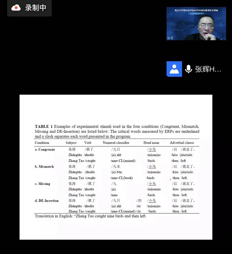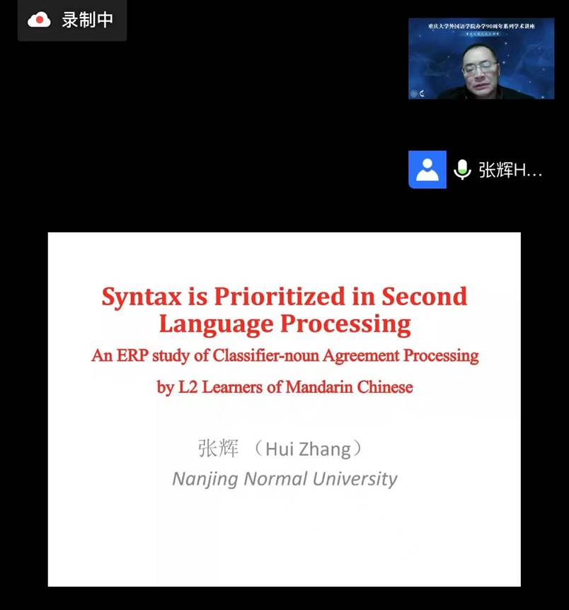 办学90周年系列学术讲座继续如期在线上举行。本场讲座的主题为《二语加工中的句法优先:汉语耳语学习者‘量名一致’加工的事件相关电位研究》。主讲人张辉教授系南师大博导,江苏省外国语言学学会常务副会长,湖北楚天学者讲座教授,中国英汉语比较研究会认知语言学专业秘书长兼副会长,中国英汉语比较研究会心里语言委员会副会长,中国语文现代化学会神经语言学专业委员会副会长等。国家社科基金学科规划评审专家,并主持5项国家社会科学和自然科学基金项目,其中两项为国社重点项目,出版学术著作10部,国内外发表论文100余篇。张教授为讲座涉及领域的资深专家,为我院师生奉献了一场专业深入的学术讲座。