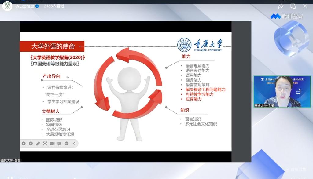 教研会分为如下环节:解读新工科大类人才培养对大学英语课程的要求、创新人才培养与课程思政教学案例分享、专家点评与交流互动。首先,彭静教授针对国家及重庆市经济社会发展对高等教育的要求,介绍了漫蛙