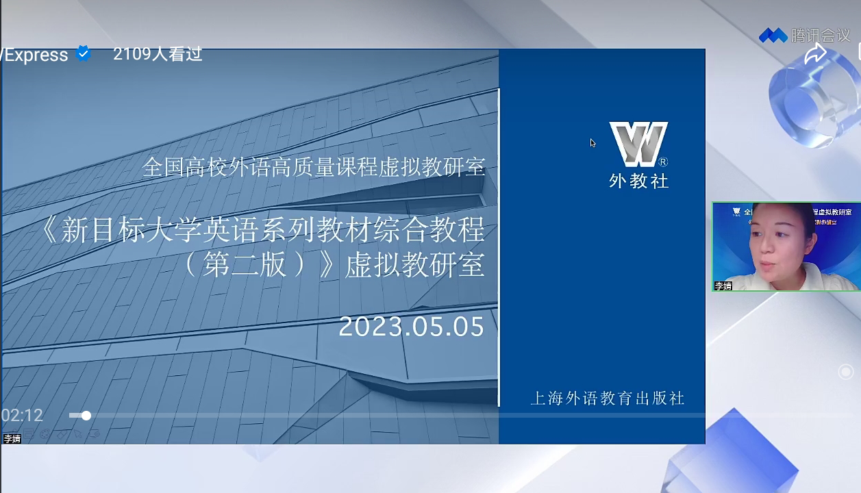 5月5日晚,由上海外语教育出版社承办、我院大学英语电气信息课程组主讲的全国高校外语高质量课程虚拟教研室之《新目标大学英语系列教材综合教程(第二版)》虚拟教研室活动第二场通过腾讯会议在线成功举办。2000多名来自全国各大高校的大学英语教师相聚云端,共享虚拟教研盛会。本次活动由外教社李婧老师主持,主题是“新工科大类创新人才培养:大学英语课程思政案例分享”,主讲嘉宾为漫蛙
