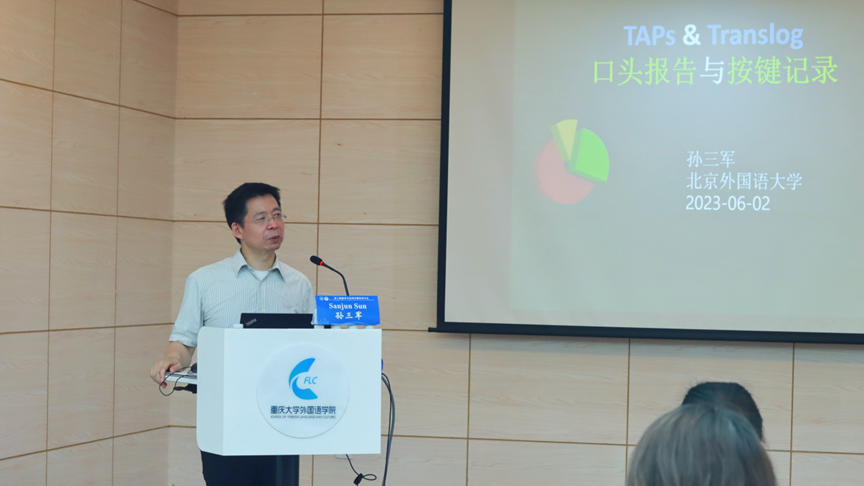 楼501会议室主持了题为“翻译认知与有声思维法”的工作坊。工作坊伊始,孙老师先简要介绍了翻译过程研究的发展历史,特别是研究方法的发展变化,进而引入本次工作坊的主题—有声思维法。活动中,孙老师针对有声思维的应用领域、分类、发展历史和现状等方面,以自己的研究为例,进行了详细的讲解。接着,在实际操作方面,孙老师还细致讲解了有声思维的具体操作步骤、注意事项、分析方法及工具等知识。最后,孙老师对比了两款有声思维分析工具Translog和Inputlog的特点并现场进行了操作演示。