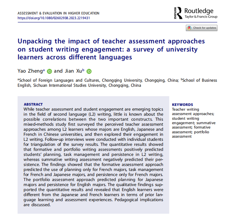 近期,我院教师郑尧博士和四川外国语大学徐建博士在SSCI教育与教育研究一区期刊Assessment & Evaluation in Higher Education(2021年影响因子/JCR分区:4.44/Q1)上合作发表学术论文“Unpacking the impact of teacher assessment approaches on student writing engagement: a survey of university learners across different languages”。郑尧博士为论文第一作者,论文为其主持的国家社会科学基金项目“积极心理视域下中国外语学习者多语写作投入的多维度动态研究”(21CYY018)阶段性研究成果。