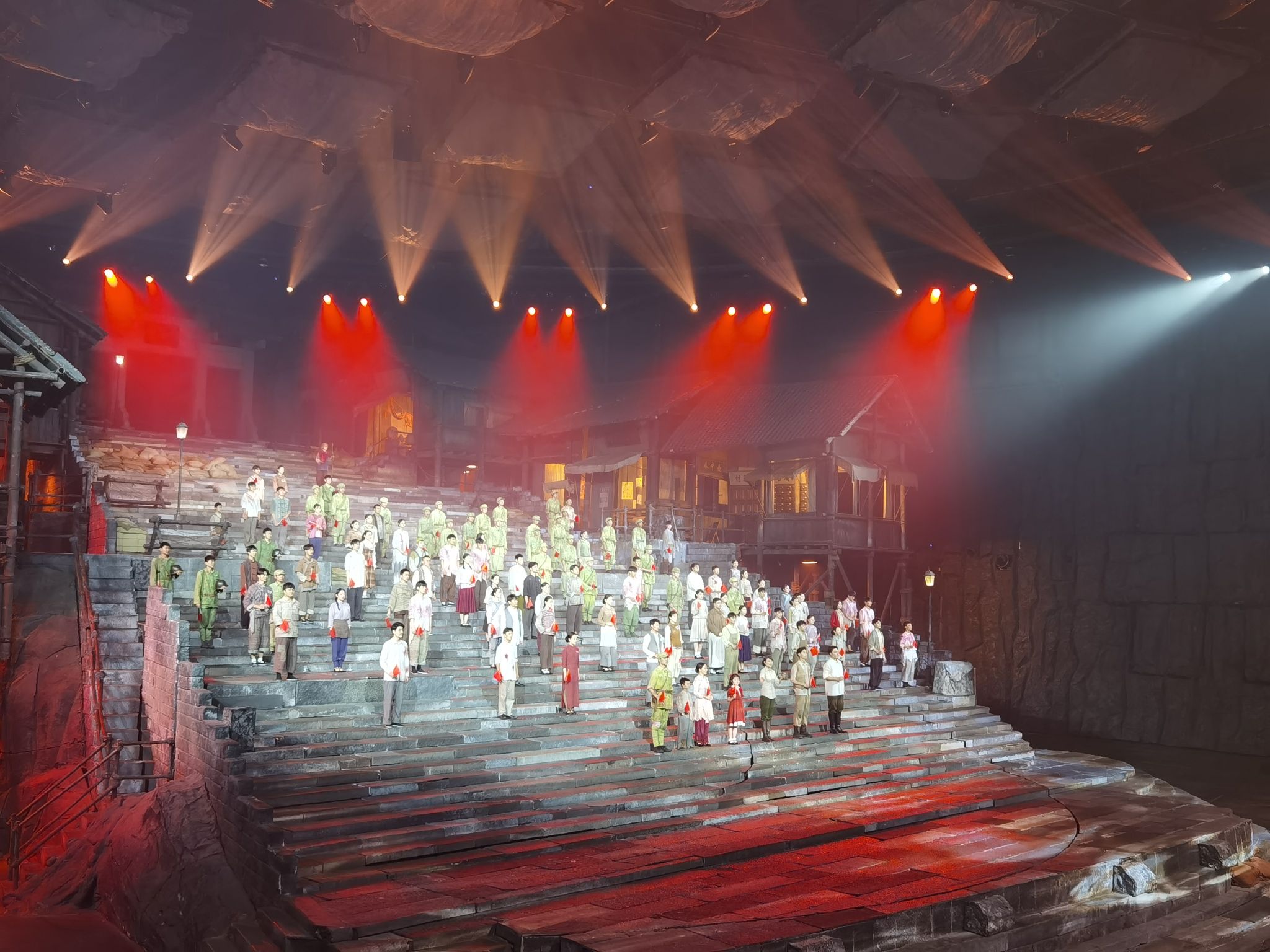 演出最后,观众全体起立,挥舞着国旗,眼含热泪和演员们一起高唱《义勇军进行曲》,嘹亮的歌声在剧场上方久久环绕。