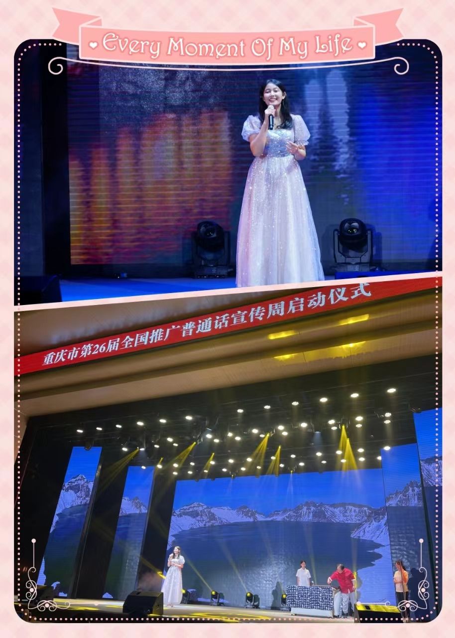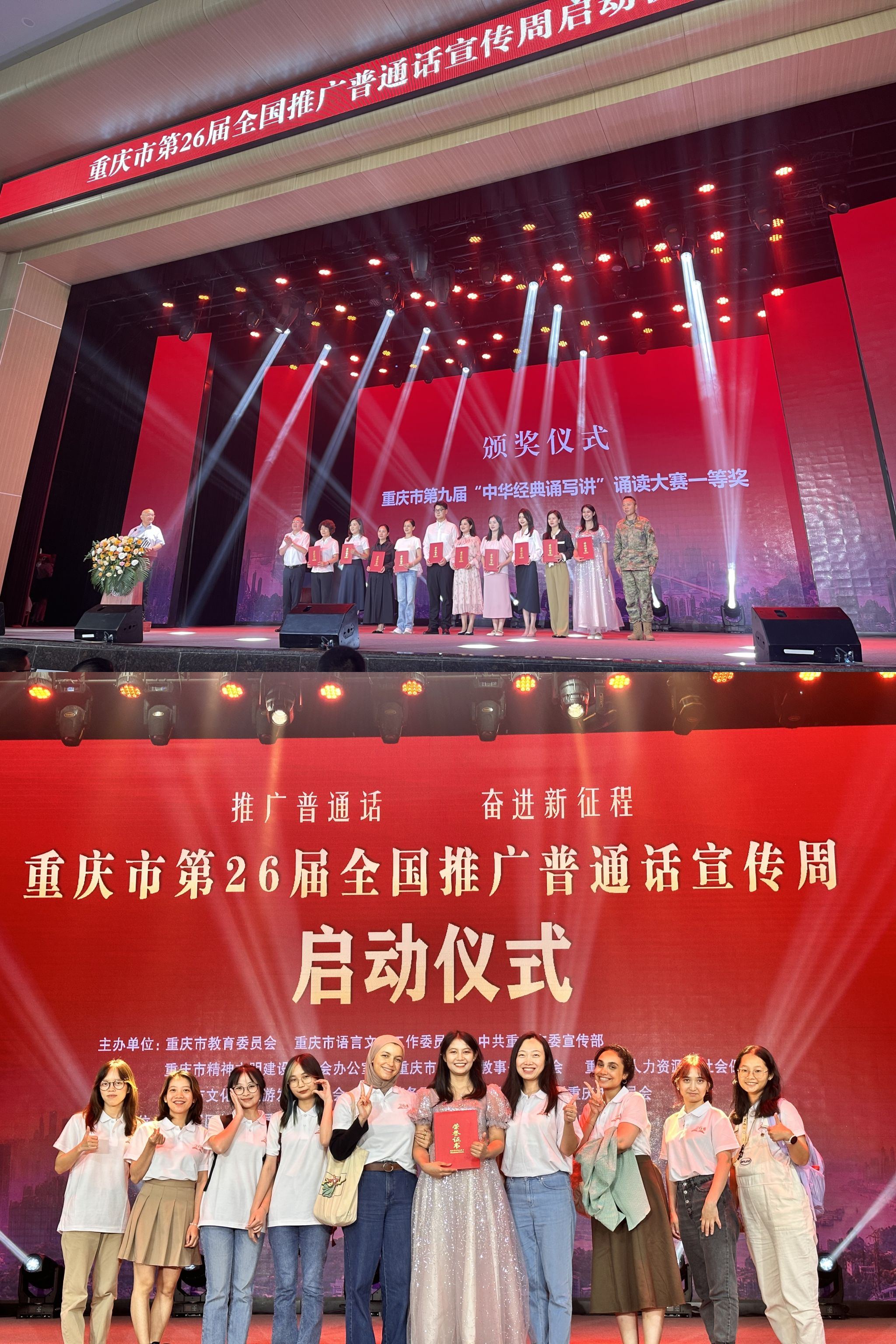 2023年9月12日,重庆市第26届全国推广普通话宣传周启动仪式暨重庆市第九届“中华经典诵写讲”颁奖仪式在重庆市第一中学举行。由电影学院刘姗姗副教授指导的重庆市诵读大赛留学生组一等奖获得者——来自泰国的鲁芬(漫蛙