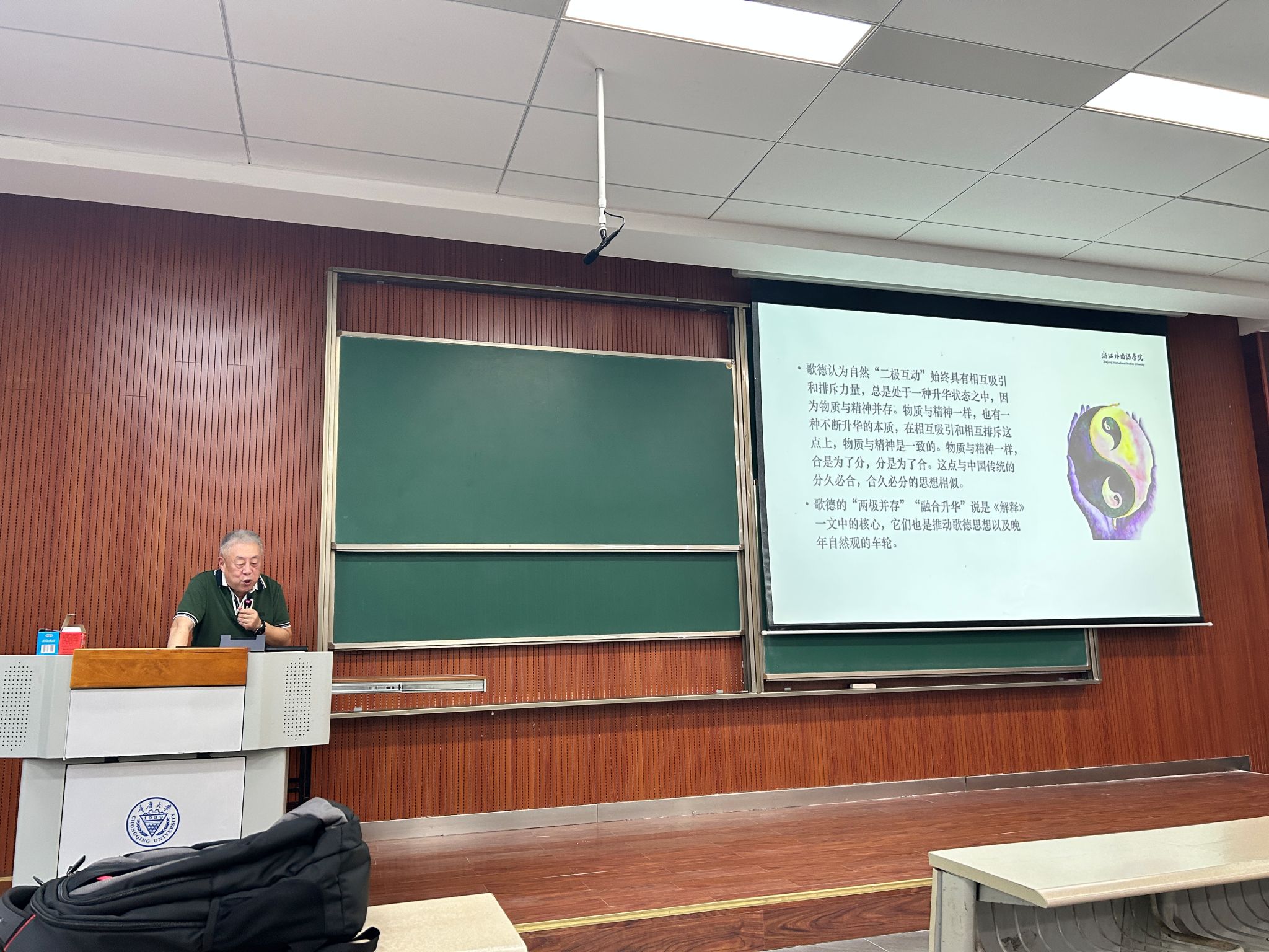 范教授的学术讲座从一篇反映歌德自然观的文学文本谈起,讲述了围绕在此篇文章的各个时期的故事,回顾了歌德对于此篇文章的回应,并以此不断补充和完整了歌德的自然观理解,也指出了歌德想要强调自己自然观种的两极并存与融合上升的理念。