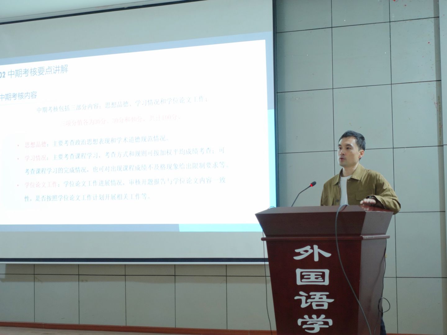 会上,隋海兵首先向学生展示与研究生培养环节相关的校院两级文件,根据文件要求,研究生需要完成开题、中期考核、预答辩、送审、答辩5个重要节点。