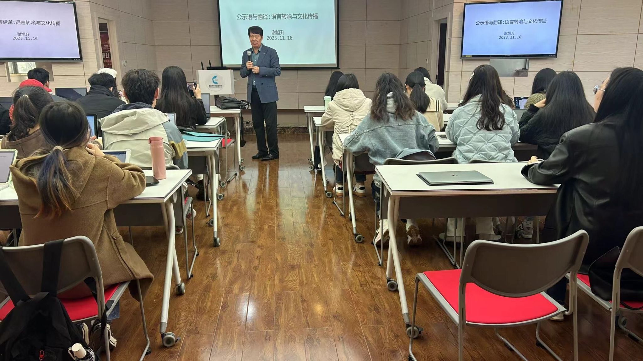 随后,谢教授分享了他在翻译新疆塔斯特景区和亚欧博览会等地的公示语时的经验。他强调,翻译过程是一种源文文化和译文文化互动和对接的过程,要求翻译者不仅精通语言,还要深刻理解文化背景。