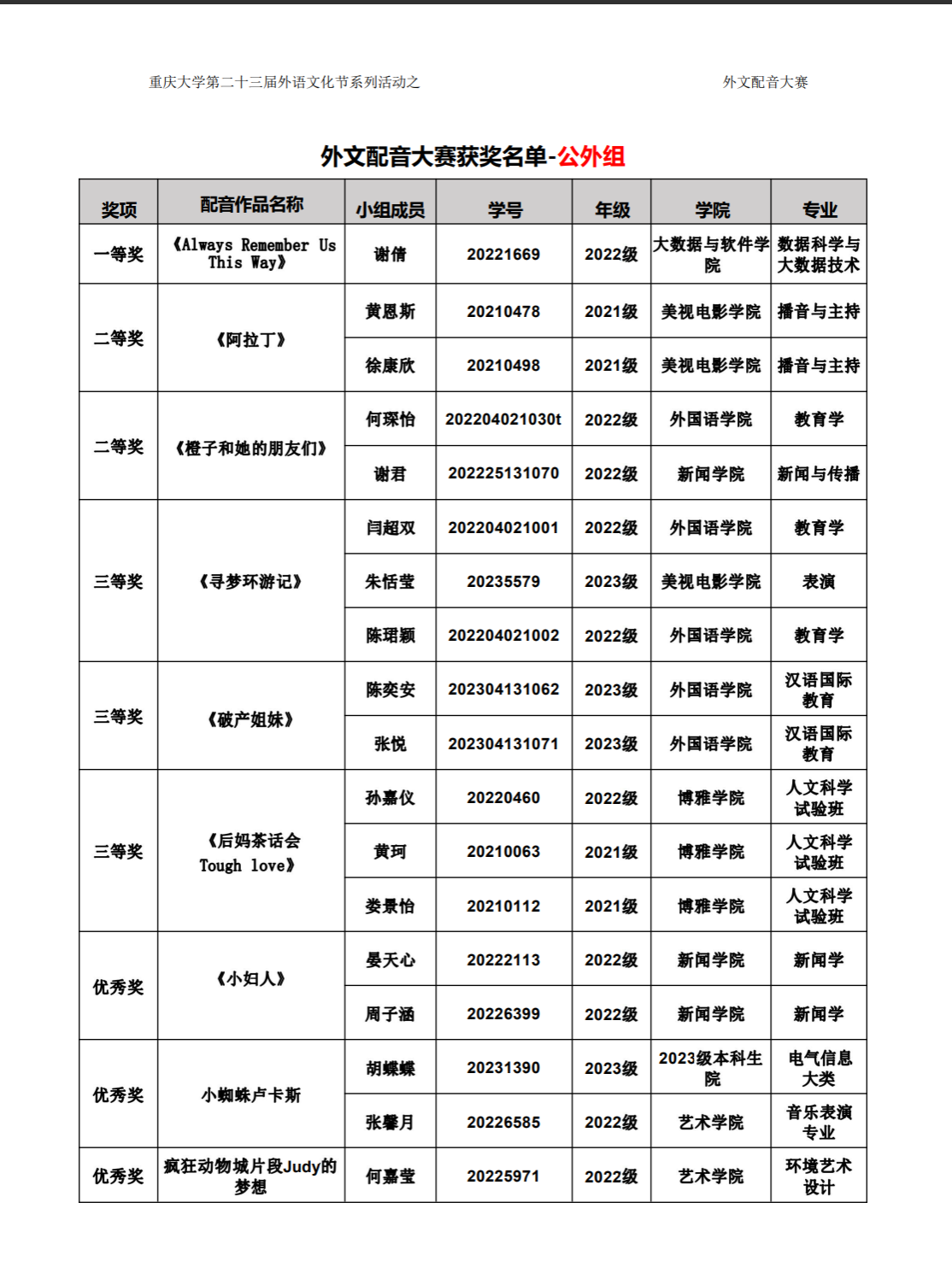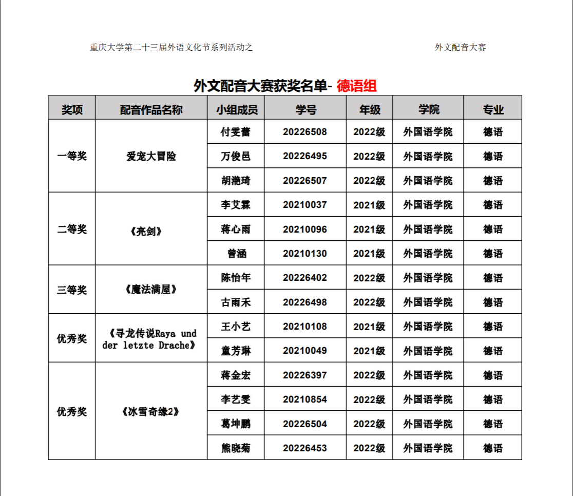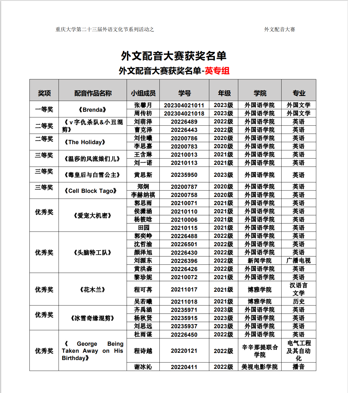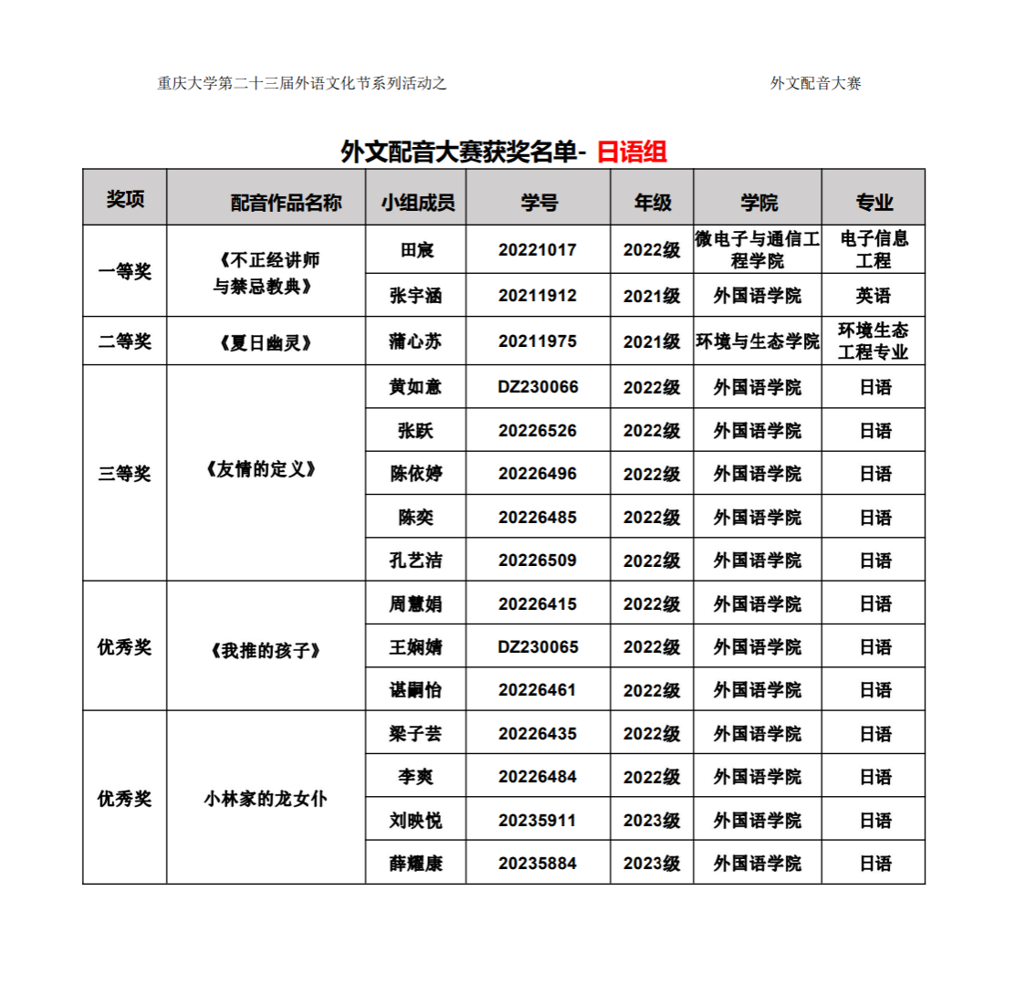 由漫蛙 主办、漫蛙 承办的漫蛙 第二十三届外语文化节系列活动之外文配音大赛已经结束。赛事自11月18日启动以来,吸引到全校多支队伍前来参与,评选出31个获奖组。其中,英语专业组共11个获奖组29名获奖选手,公共外语组共9个获奖组18名获奖选手,日语德语组共10个获奖组29名获奖选手。 现将外文配音大赛获奖名单进行公布。