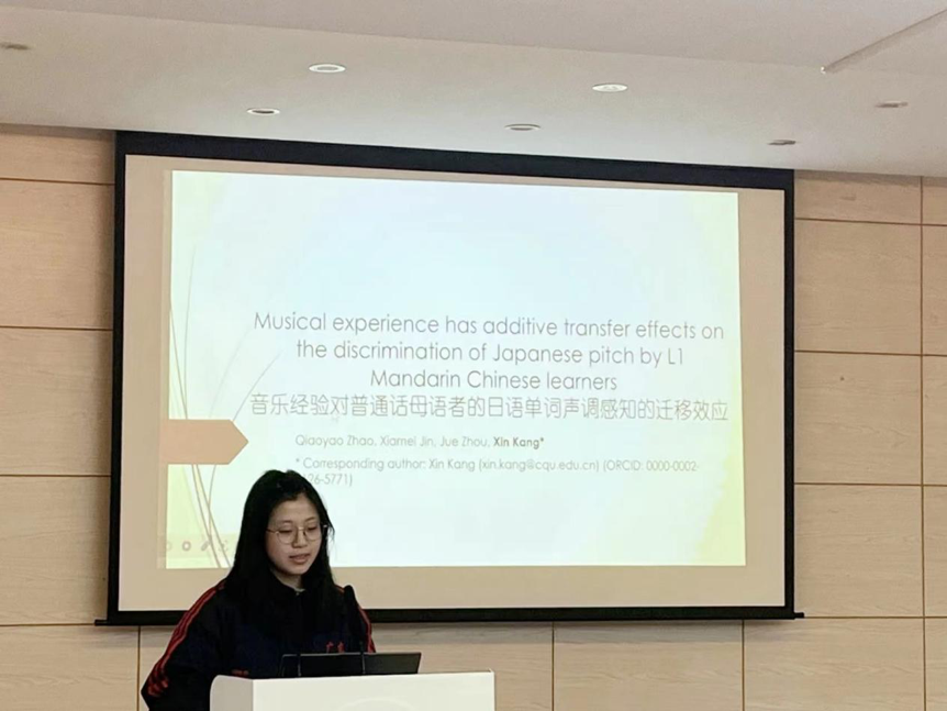 研一的赵巧尧同学在本科毕业论文研究的延长线上,围绕“音乐训练对日语单词声调感知的影响”这一研究课题,先是介绍了相关的先行研究和该试验的研究目的,接着就实验设计如测试工具、内容等进行了详细介绍。在分享研究经验的同时也反思实验设计的不足之处,阐明了未来的改进方向。