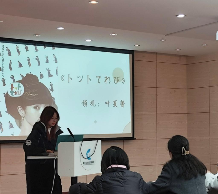 本期活动由大一薛耀康同学担任主持。大三张玉佳同学作为领读人率先开讲,她详细介绍了该书的写作背景,分享了国内对于《窗边的小豆豆》的阅读与接受情况。研一李柳燕同学也作为领读人分享了《窗边的小豆豆》在日本的研究与阅读概况,分析日本读者的读后感并展示了词云图研究成果,还就两篇代表性研究论述进行了具体介绍。大二叶夏馨同学作为领观人分享了该书衍生的影视作品《小豆豆电视台》的主要内容及重要片段,围绕影像与文本的关系进行了讨论。随后,与谈人大三吴笑恬同学由书中内容延申到明治维新时期日本肉食解禁的历史背景,帮助大家拓展了相关专业知识。另一位与谈人研二宋诗雨同学分享了自己读后的感想。以上由活动策划小组同学们带来的精彩分享,让参与者对作品有了多角度的深入理解。