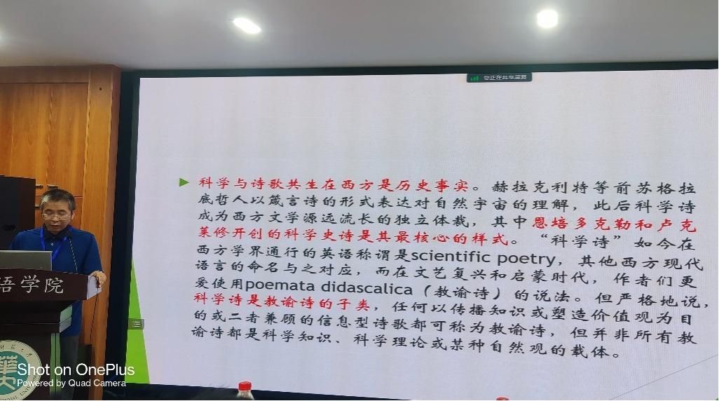 李永毅教授应邀做了题为“西方科学诗的演化”的大会发言,并主持了四川大学熊辉教授和北京联合大学黄宗英教授的大会发言。骆雨和董岑雨菲同学在分组讨论中宣读论文,和超和尹子璇同学在研究生论坛分享研究发现。四位同学的论文选题新颖,论证严谨,受到了点评嘉宾和在场师生的好评。