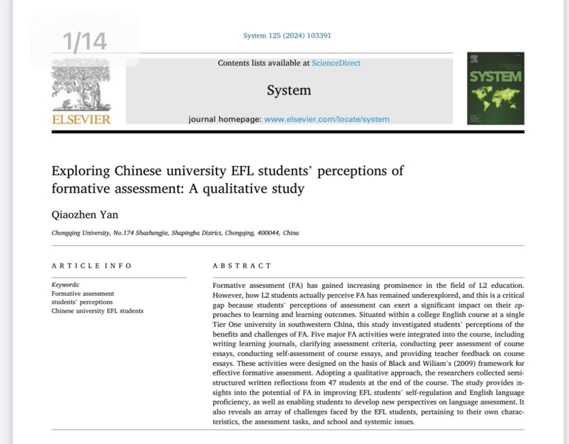 近日,我院青年教师颜巧珍在语言学类SSCI期刊System发表学术论文。该论文题目为 Exploring Chinese University EFL Students’ Perceptions of Formative Assessment: A Qualitative Study,颜巧珍老师为论文唯一作者,论文受漫蛙