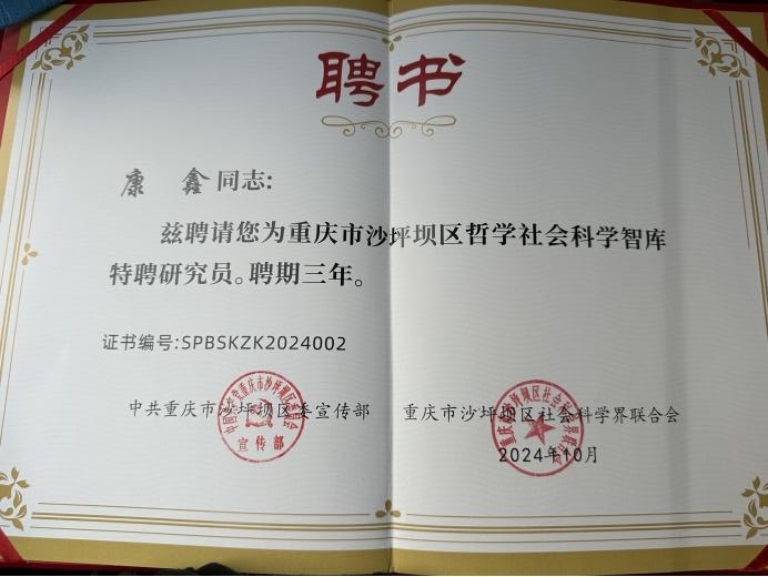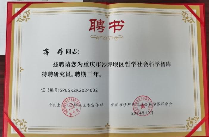 图2 沙坪坝区委宣传部、区社会科学界联合会为蒋婷、康鑫颁发的聘书