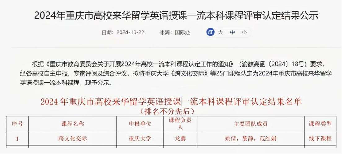 龙藜负责的《跨文化交际》课成功获评2024年重庆市高校来华留学英语授课一流本科课程。