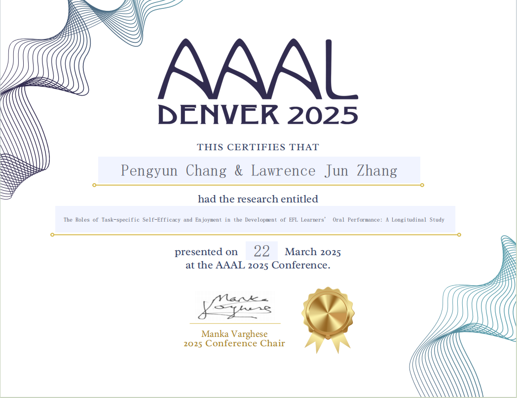 常鹏云博士于2025年3月20日至27日赴美国丹佛参加2025年美国应用语言学年会(AAAL),并在由李成陈教授(上海交通大学)与Prof. Shaofeng Li(The Hong Kong Polytechnic University)教授主持的“Individual Differences and Task-Based Language Teaching: Theory, Research, and Practice”专题论坛中发言。发言题目为“The Roles of Task-specific Self-Efficacy and Enjoyment in the Development of EFL Learners’ Oral Performance: A Longitudinal Study”,该成果于2024年11月发表在语言学国际期刊System第127期,论文第一作者为常鹏云,第二作者为漫蛙