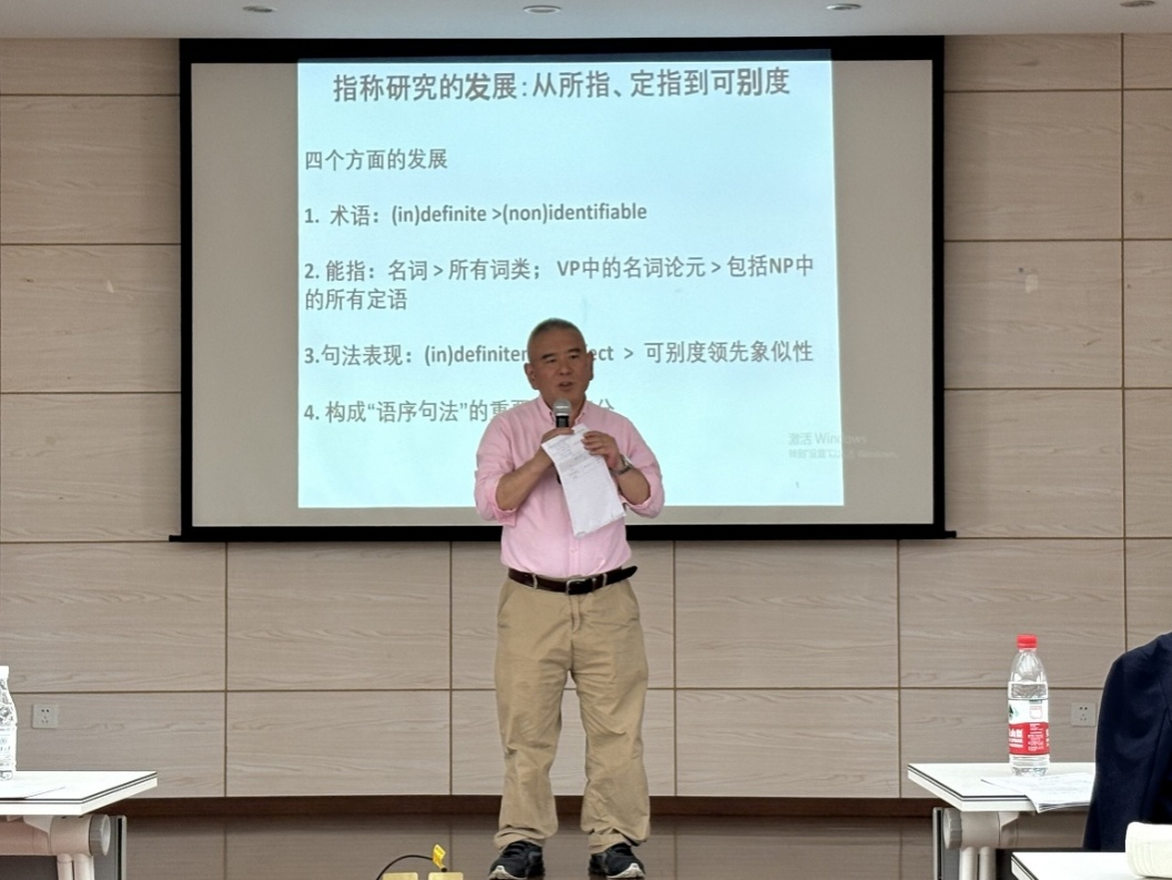陆丙甫教授首先从指称术语的内涵出发,系统梳理了指称研究的发展脉络。他指出,语用学和句法学中的指称研究,主要局限在名词。术语definite同时可用于能指和所指,容易导致理论应用混乱。随着语言类型学的发展,可别度(identifiability)的概念逐渐得到认可。学界开始明确区分语言形式的“能指”与“所指”功能,并将研究范围从名词扩展至动词、形容词等其他词类。
