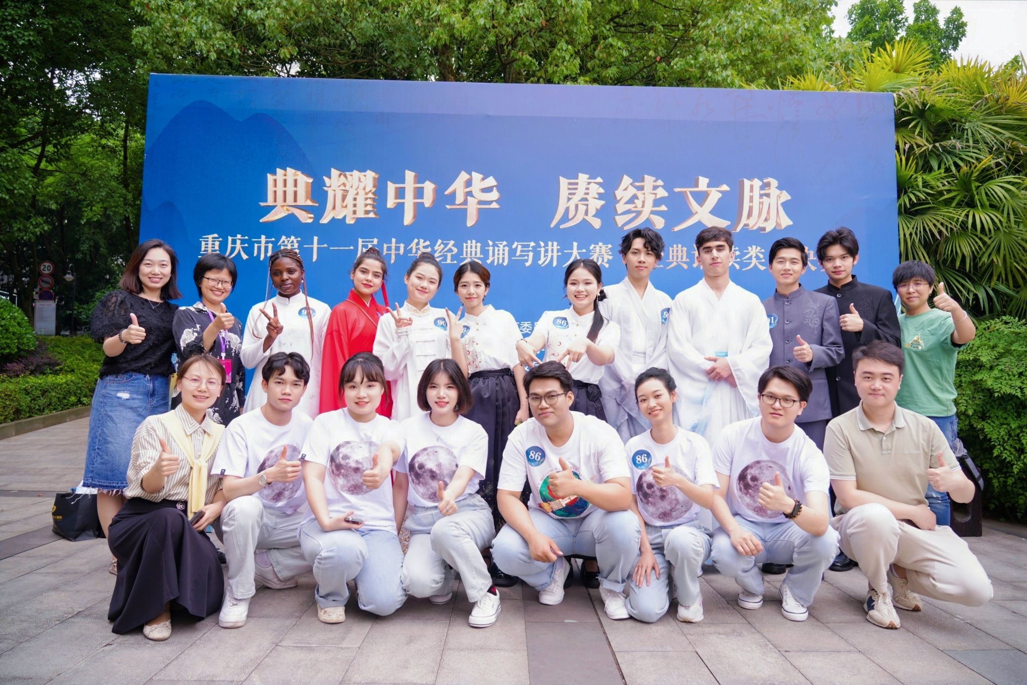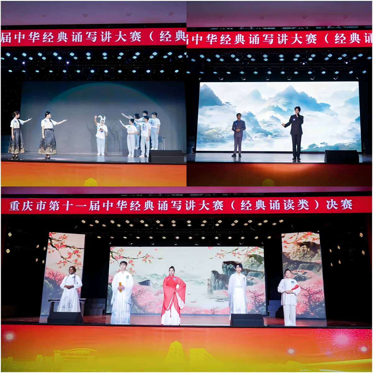 、美视电影学院、经管学院来自六个国家的15名留学生组成的三个团队,分别以作品《玉盘•月梦》、《赤壁赋》、《道德经》斩获重庆市一等奖。本次大赛的参赛作品以“差异化选题”为策略,通过精细的语言技能指导和独特的舞台设计,从古今对话、经典重构、价值共享等维度切入,赢得了评委的高度认可。